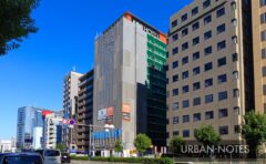 後ろにはザ・パークハウス谷町5丁目(25階建て・高さ82m)が建っている